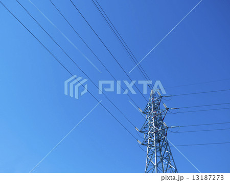 電気塔と電線、雲の切れ目 文字入れスペースあり