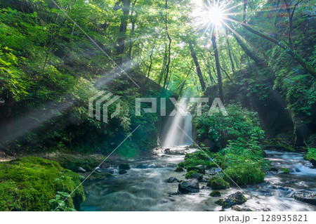 夏の軽井沢 竜返しの滝に差し込む光芒