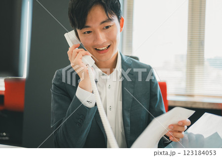 パソコンの前で電話対応するスーツの男性