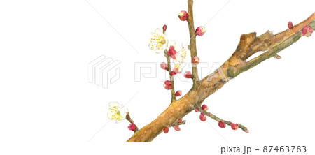 枝付き白梅の花と蕾【手描き水彩画】白バック 透過背景
