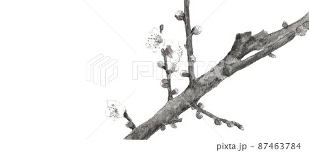 枝付き白梅の花と蕾 モノトーン【水墨画風水彩画】白バック 透過背景