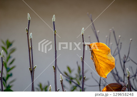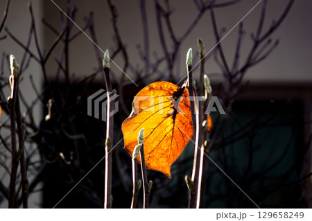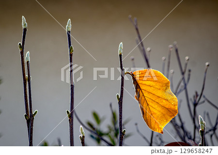 初冬の陽射しに輝くハクモクレンの冬芽と一枚の枯葉