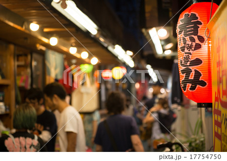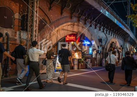 夜の東京都内、鉄道ガード下の風景 飲食店グルメ、仕事帰りのサラリーマン他の後ろ姿を撮影