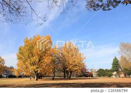 涸れた蓮池のある晩秋の21世紀の森と広場風景