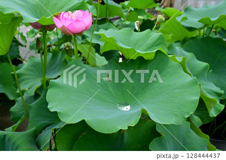夏の朝の景色 朝日に照らされた美しいハスの花と煌めく水玉