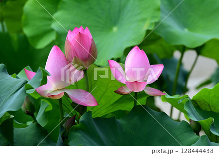 初夏の朝の景色 美しく咲いたハスの花