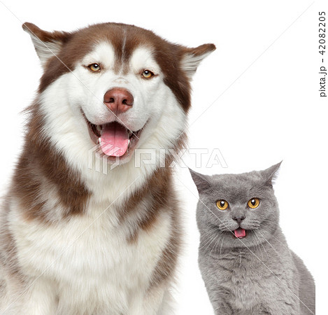 Happy pets. Husky dog and British cat