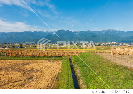 稲架掛けと黄金色の水田地帯【松本市中山】