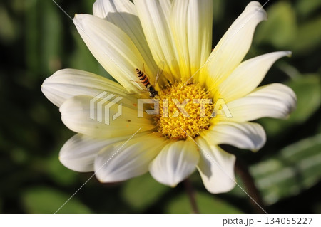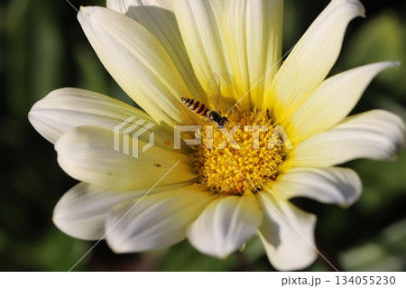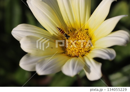 秋の庭に咲く薄黄色のガザニアの花に止まるホソヒメヒラタアブと極小のアリの様子