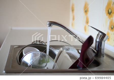 Dirty dishes and unwashed kitchen appliances lie in foam water under a tap from a kitchen faucet