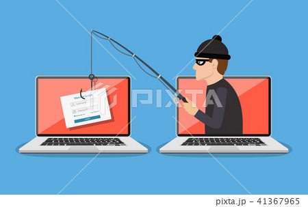 Cyber security flat vector illustration. Computer fraud and internet scam, hacker thief steal online and email data.