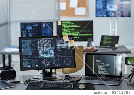 Side view of a hacker hacking into corporate data servers from his underground hideout. The place has a dark atmosphere, lots of displays