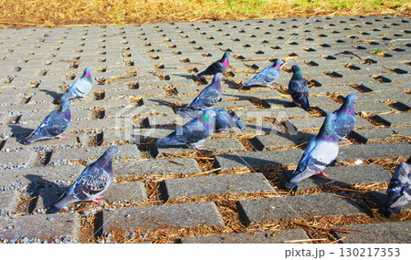 河川の護岸に集まっているドバト(カワラバト)のいる風景
