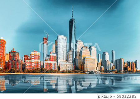 Aerial view of the panoramic landscape sunset large spectacular buildings in New York City