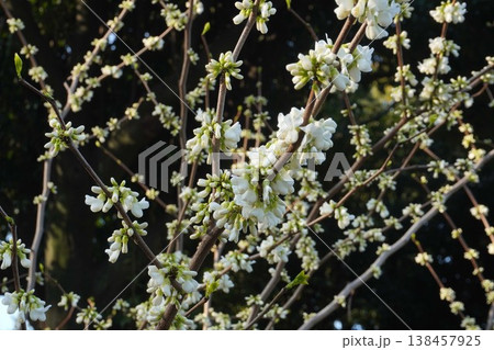 ハナズオウ 花開く枝先 白の背景