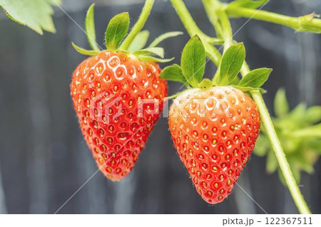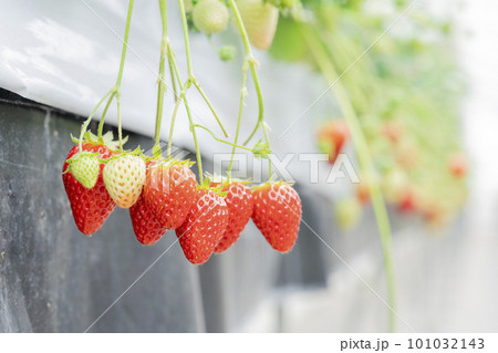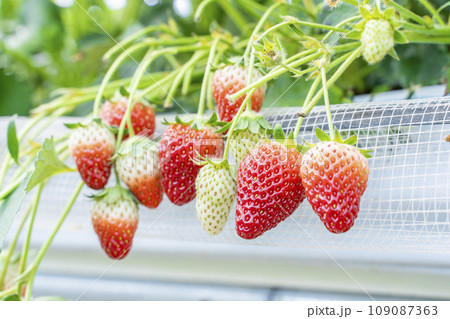 赤く実ったイチゴの果実 ハウスの苺 いちご狩り 宮城県山元町