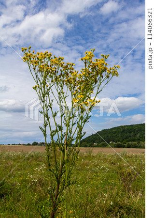 Yellow flowers of Senecio vernalis closeup on a blurred green background. Selective focus