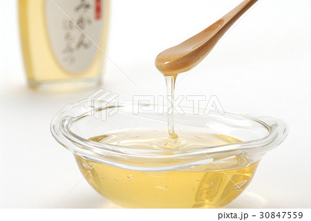 ガラスボールに注がれるハチミツシロップ 写真素材