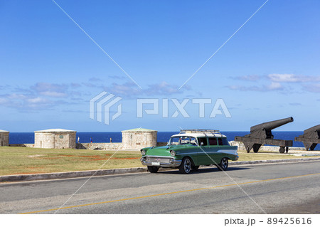 キューバ ハバナ マレコン通りを走るクラシックカー