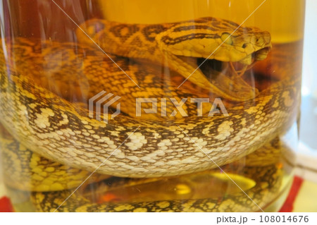 沖縄の市場で見つけた精力剤として滋養強壮に効果のある口を開けた蛇が丸ごと入った高級なハブ酒