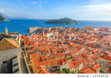 城壁から眺めるドゥブロヴニクの旧市街とアドリア海に浮かぶロクルム島