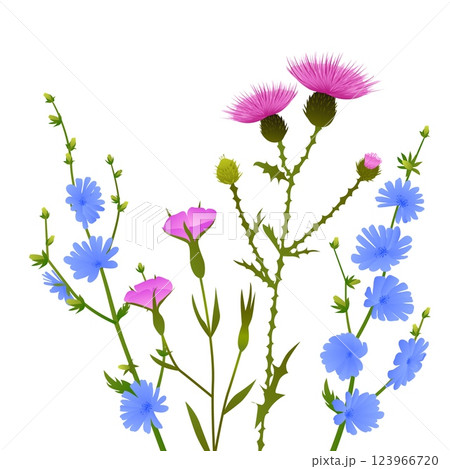 Wildflower bouquet with blooming blue chicory pink thistle and field bindweed flowers isolated on white background botanical illustration of colorful meadow plants with green stems leaves and blossoms