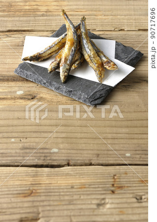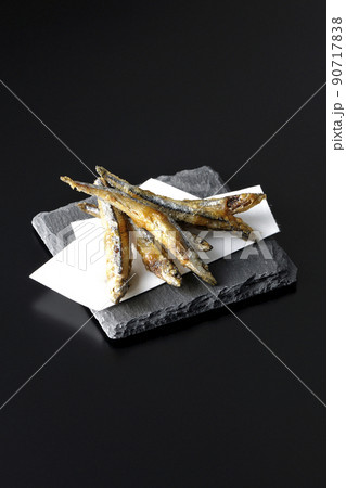 スレートプレート、天紙の上のきびなごの唐揚げを黒背景で撮影