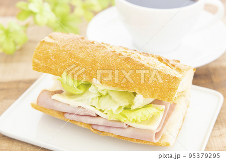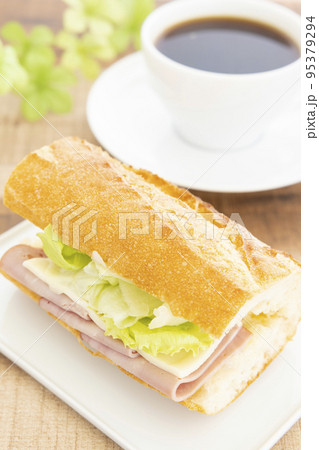 美味しいフランスパンのパリジャンサンドイッチとコーヒー