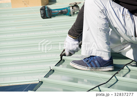 屋根工事 ガルバリウム鋼板を加工している屋根職人