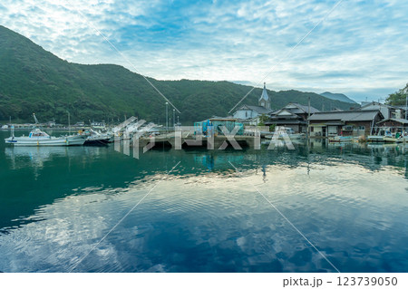 熊本県天草市 世界文化遺産に登録された天草の崎津カトリック教会の朝の海からの眺め