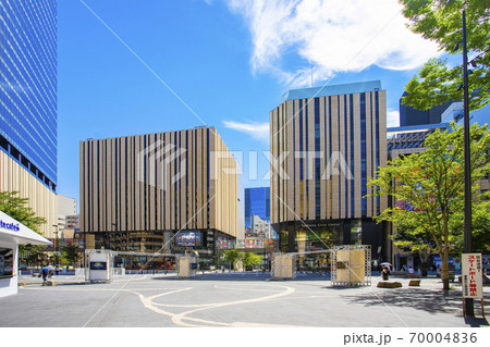 日本の東京都市景観 青空に映える池袋駅東口にあるハレザ池袋やアニメイトなどを望む