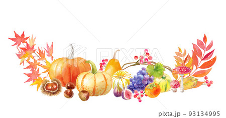 ハロウィンの装飾水彩イラスト。フレームデザイン。カボチャや栗、柿、ぶどうの収穫。