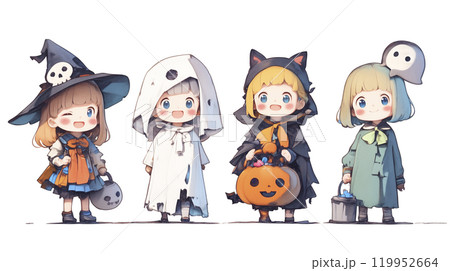 ハロウィンの仮装をした子どものイラスト(手書き風・かわいい・4人)