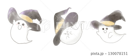魔法使いの帽子を被った黒猫と可愛いお化けのハロウィン水彩イラストセット