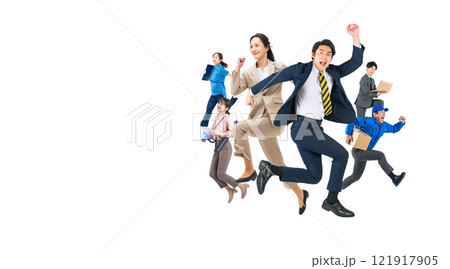 元気にジャンプする様々な職業のグループの全身写真