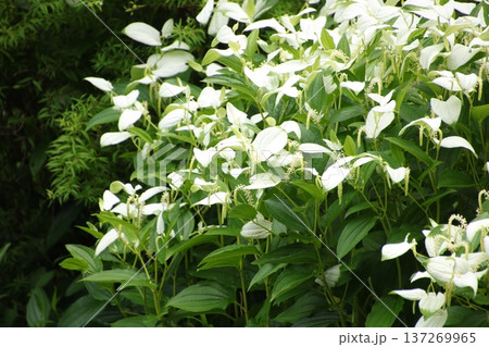 初夏の庭園で白い葉が特徴的なハンゲショウの群生