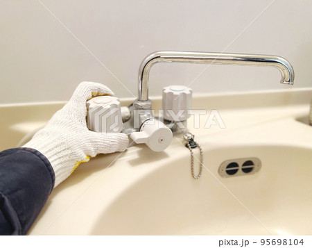 ユニットバスの水道の混合栓を持つ軍手をはめた手元