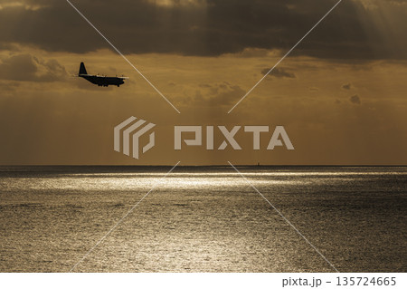 夕方の海とC-130輸送機
