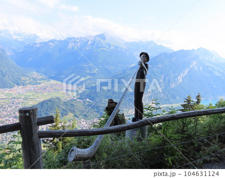 初夏のヨーロッパ・アルプス ハーダークルム展望台に向かう山道で迎える ホルンを吹く少年の像