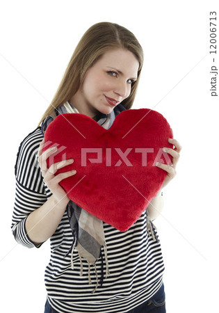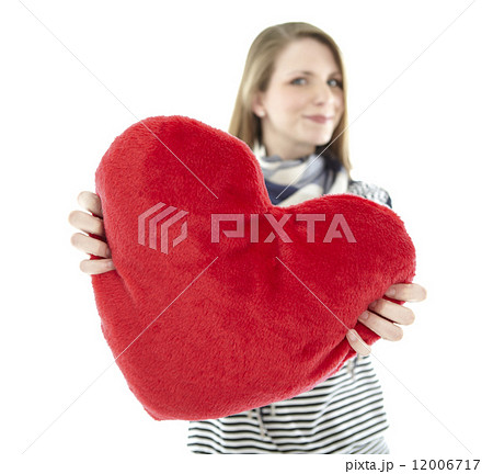 Woman holding heart pillow in the camera
