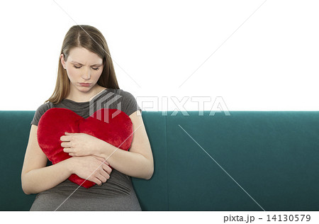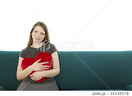Woman cuddling with a heart pillow