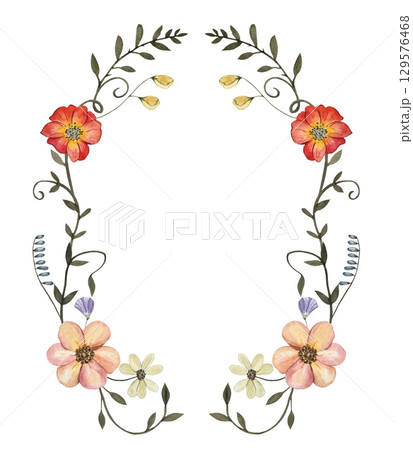 Floral wreath with dark green leaves and dried pressed flowers. Watercolor