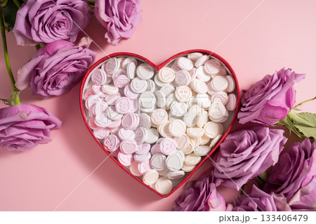 Heart-shaped candies in heart shaped box, over pink background, abstract food love background