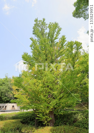 岩手県盛岡市の盛岡城跡公園の石垣とカツラの木の彩 晩秋の城趾の散歩道