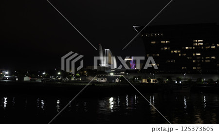 ライトアップされた横浜港の夕景 大さん橋ふ頭ビル前桟橋とマリンタワー