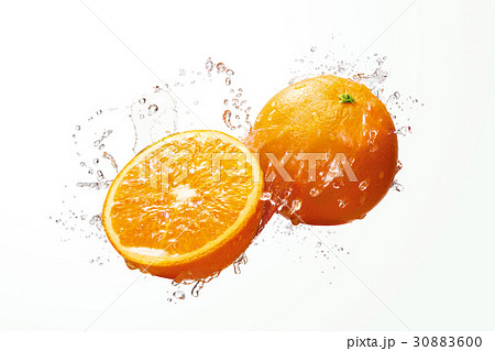 The image captures a dynamic scene featuring an orange half and a splash of orange juice against a white background