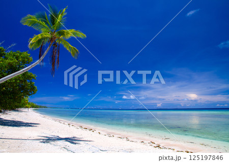 オセアニア・ポリネシアの島国ツバル 首都のフナフティ環礁フォンガファレ島のラグーンとビーチとヤシの木
