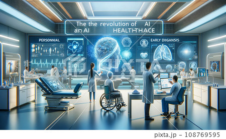 未来のバイオ研究所で、科学者達がAIを駆使してDNAホログラムを分析し、遺伝子工学と医学研究の最前線