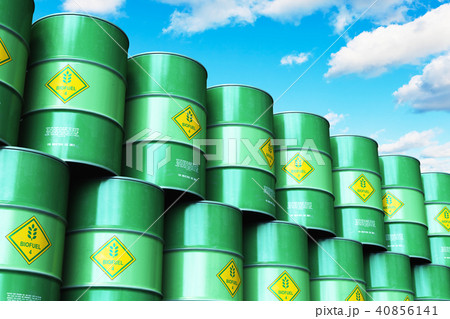 Group of green stacked biofuel drums against sky