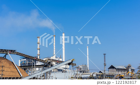 Biomass power plant with wood fuel storage system amidst blue sky. Alternative energy business from plants and wood waste. Renewable energy, Green energy, Recycling and Natural resource conservation.